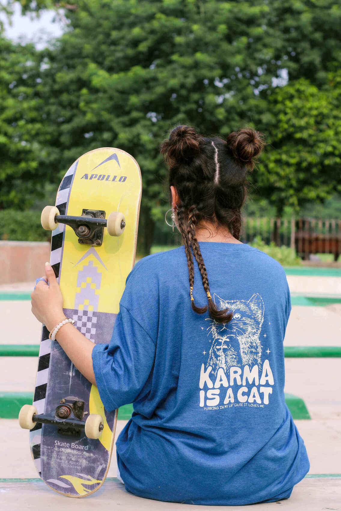 This Taylor Swift "Karma Is A Cat" Oversized Drop Shoulder Blue Tee is the perfect addition to your wardrobe. Made with high-quality materials, it offers both style and comfort. With its unique design and oversized fit, you'll be sure to stand out from the crowd. Show off your love for Taylor Swift and spread positive vibes with this one-of-a-kind tee.