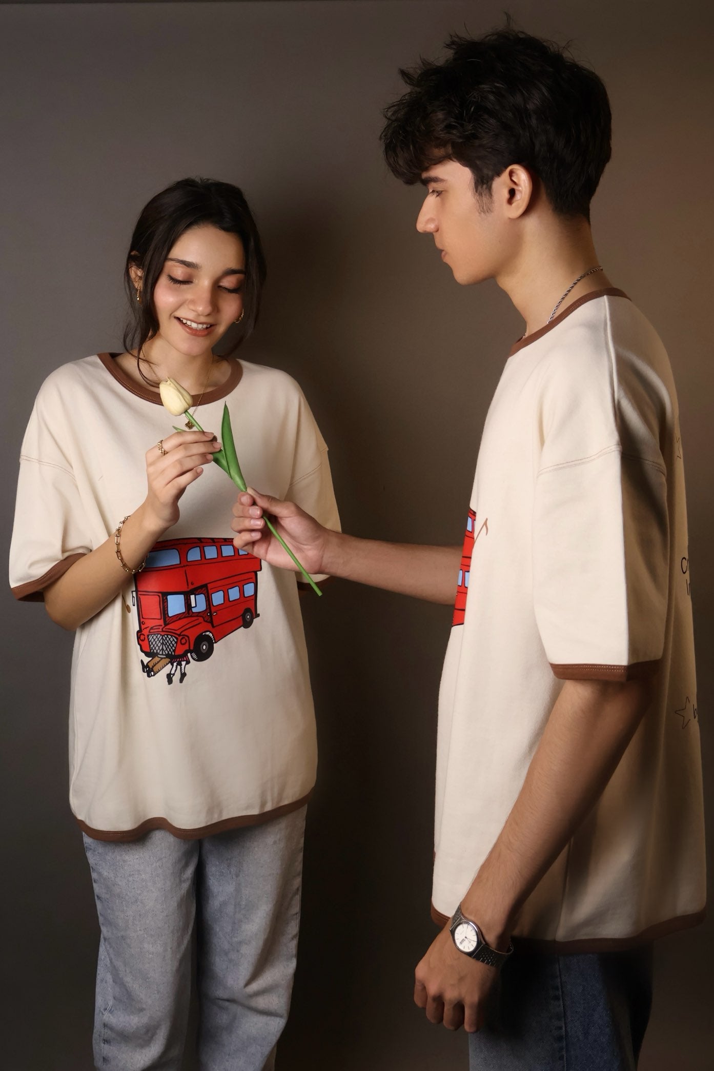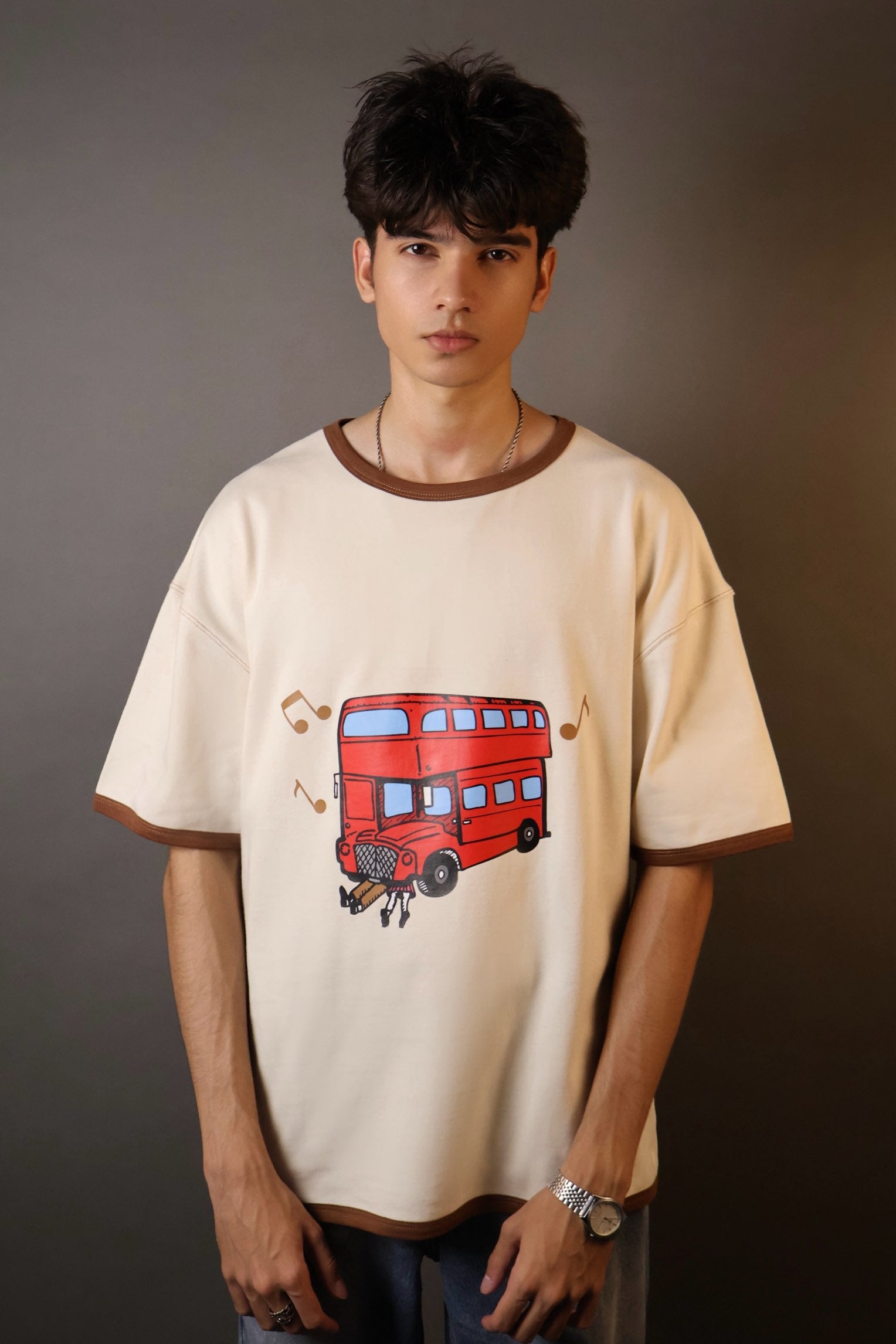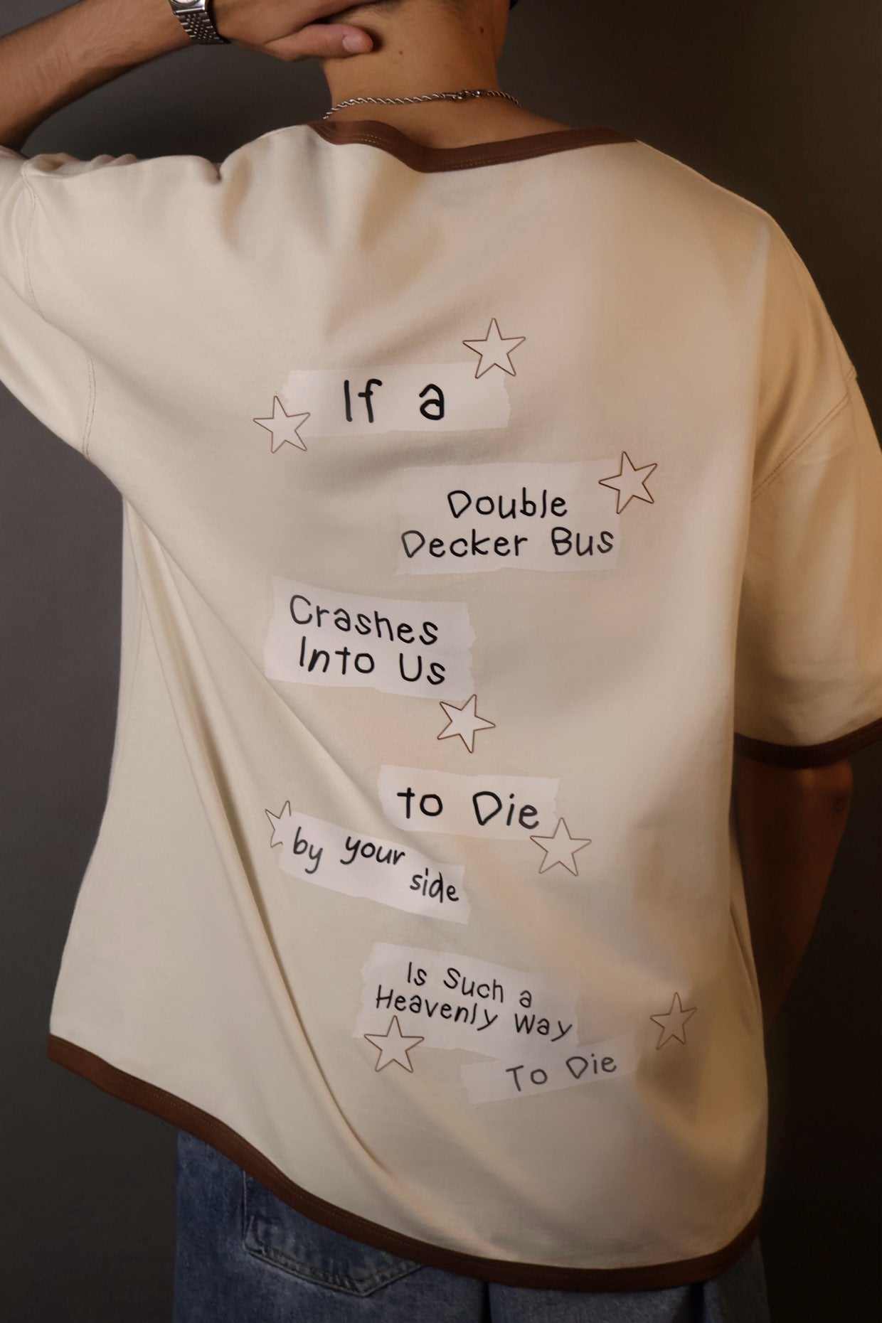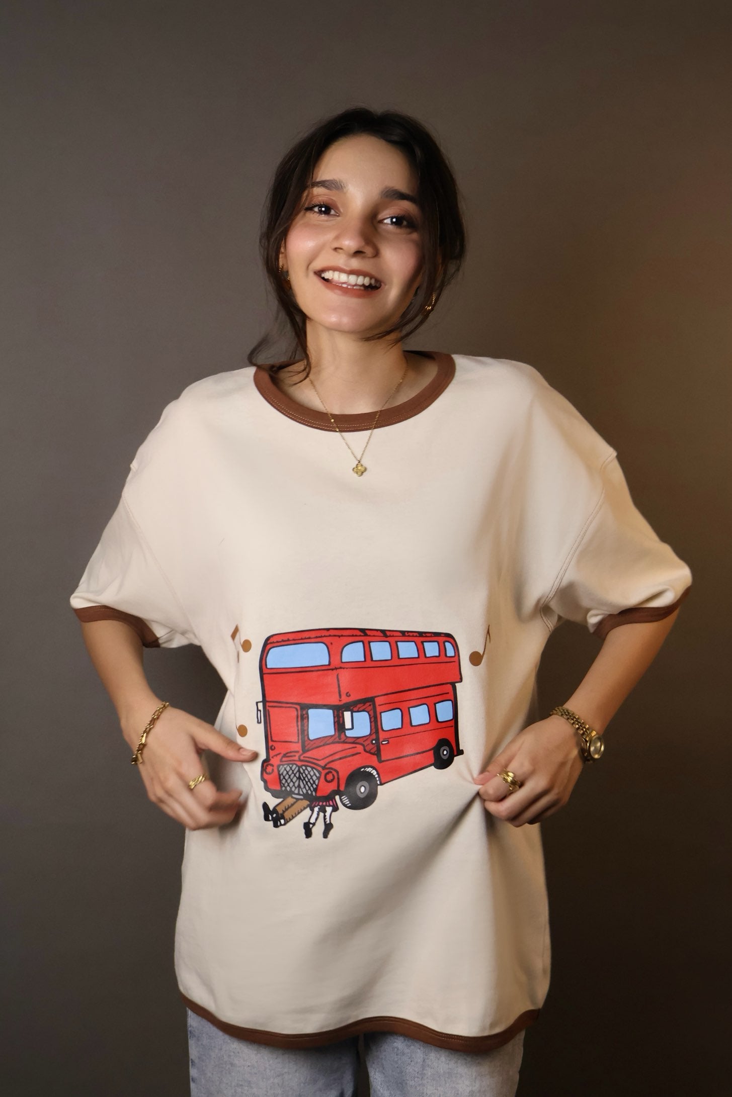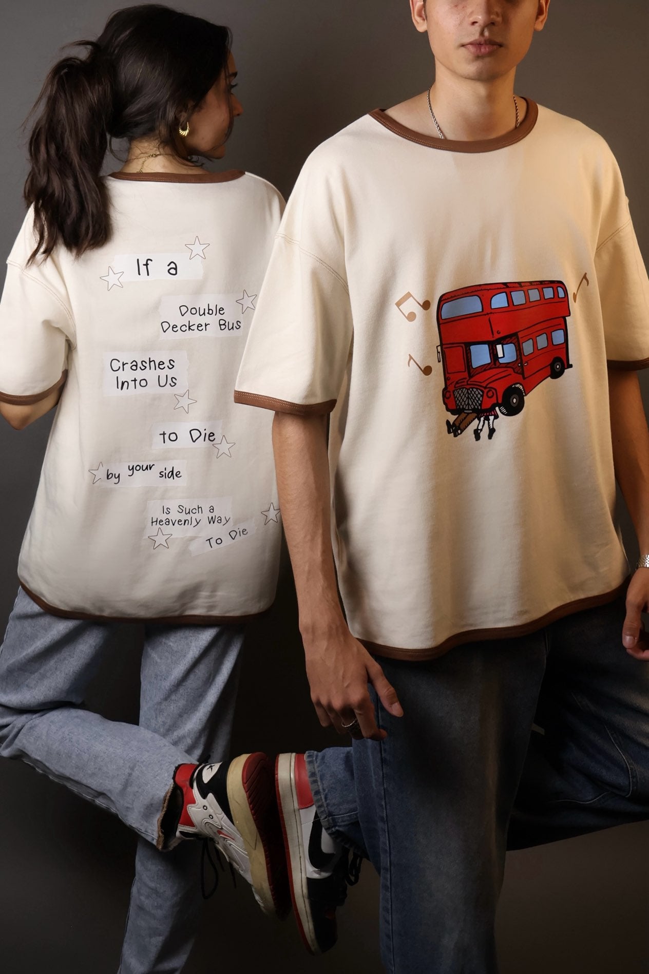 • oversized, drop shoulder, graphic tee featuring a bold red London double-decker bus on the front and dreamy lyric-inspired text on the back